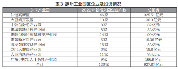 惠州市工业园有着资产体量空间大、市场改造空间大和融资体量大的特点。2020年起,惠州以“千亿园区,万亿产业”为目标,打造“3+7”工业园区新格局。一方面,优化提升大亚湾经济技术开发区、仲恺高新技术产业开发区和中韩(惠州)产业园3个国家级园区;另一方面,7个县区对标先进,打造各具特色、主导产业鲜明的千亿级工业园区。(见表3)