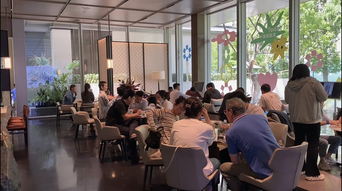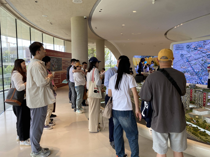 5月19日中午11点,澎湃新闻抵达位于杭州西湖区的滨江溪映听庐售楼部,已有一些看房者在交流,随后的2个多小时内,看房者人数不断增多,甚至有一些看房者因为等待销售接待的时间太长而先行离开。