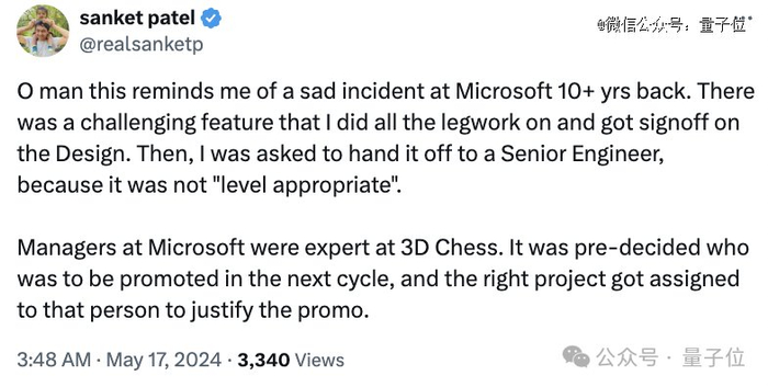 他本来负责一个十分具有挑战性的功能,已经做了所有前期工作,也得到设计部门的认可。但随后就被要求交给一个高级工程师。因为这个工作不符合“职级要求”。
