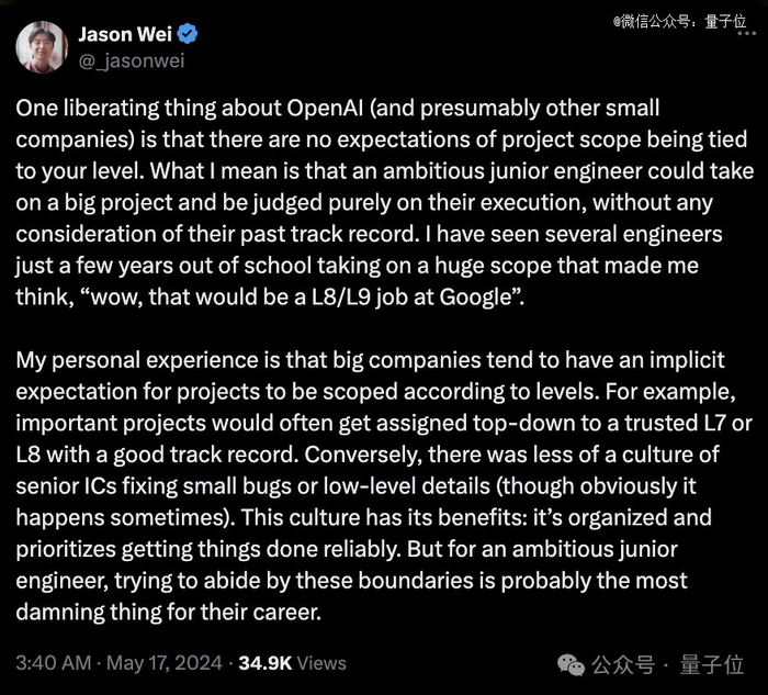 Jason Wei说,他在OpenAI见过几位毕业不久的工程师,在内部揽了一个重要的大活,他那时候心想,“哇,要是谷歌,这不得让L8/L9的员工来搞?”