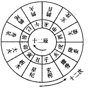 作为一种标记,它最重要的符号系统是十二辰,既能指示空间,又能指示时间。空间上的天象十二辰,一般以十二地支表示,将周天划分为十二份,根据十二地支的顺时针次序依次命名各天区,这一天象系统,被认为与岁星(古代对木星的称谓)的运行规律密切相关。唐代贾公彦注疏儒家经典《周礼·春官·冯相氏》解释道:“十有二岁者,岁谓大(即太)岁,左行于地,行有十二辰,一岁移一辰者也。”木星绕太阳公转的恒星周期为11.86年,接近12年,中国古代早期认为木星的运行规律大致是一年走一个辰次,因此根据它的运行将周天分为十二辰,但是古人也认识到木星的运行并不是均匀的一年走一个辰次,有时候走得快,会出现“超辰”的现象,即比推算的位置走得快,从而走到推算辰次的下一个辰次,因此又设计出一个“太岁”的假象天体,它的运行方向与木星自西向东的次序相反,运行速度均匀,依此来标记年岁的变化,即所谓的“太岁”或“岁阴”纪年系统,可以与岁星的运行位置参照使用。