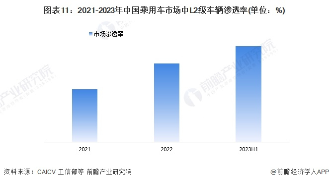 在市场渗透率方面,根据CAICV数据显示,2021年,中国乘用车市场中L2级车辆渗透率为23.5%。工信部有关负责人表示,2022年我国搭载辅助自动驾驶系统的智能网联乘用车新车销量约700万辆,市场渗透率为34.9%;2023年上半年市场渗透率进一步提升,达到42.4%。