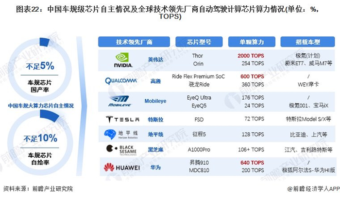 目前,自动驾驶计算芯片技术由英伟达领跑,我国车规大算力芯片的自主程度很低。英伟达最新推出的自动驾驶芯片Thor,单颗芯片的算力达到2000TOPS,国内众多自研厂商也纷纷加快研发。然而,算力的无限膨胀并非未来趋势,芯片算力存在物理上限,大算力芯片的上车应用离不开车载计算平台的支撑,车载计算平台的复杂度呈数倍提升,芯片开发还将面临功耗、散热、电磁、质量等多重挑战。
