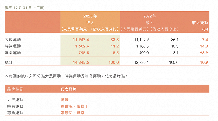 特步的收入大头来自大众运动,也就是特步主品牌,2023年该部分收入占总收入的83.3%。另外两条业务线,时尚运动(盖世威、帕拉丁)和专业运动(索康尼、迈乐)占比都很小,分别为11.2%和5.5%。不过从成长性来看,目前规模占优的时尚运动远不及专业运动,2023年,时尚运动收入增幅为14.3%,而专业运动收入增幅为98.9%,位列特步所有业务之首。