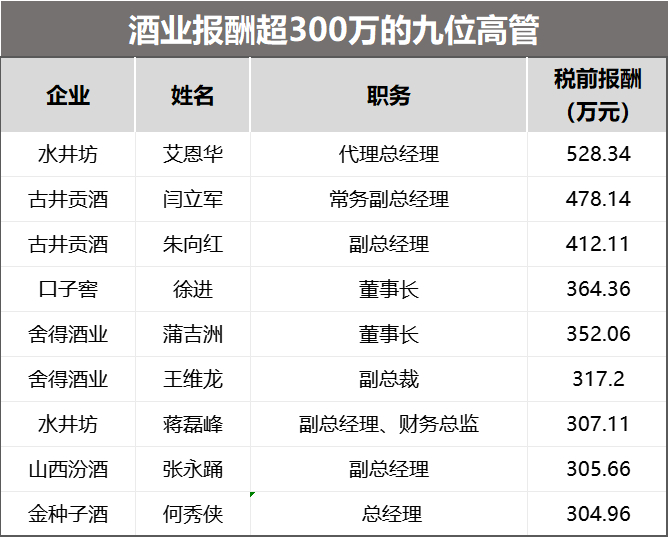 据《国际金融报》记者统计,2023年,白酒行业税前报酬过300万元的高管共有9位。其中水井坊占两位,今年3月末刚离职的前代总经理艾恩华去年税前报酬超过528万元,位列白酒行业收入的榜首,去年任副总经理、财务总监的蒋磊峰税前报酬超过307万元;古井贡酒常务副总经理闫立军以及副总经理朱向红税前报酬为478.14万、412.11万元,位列行业第二和第三。