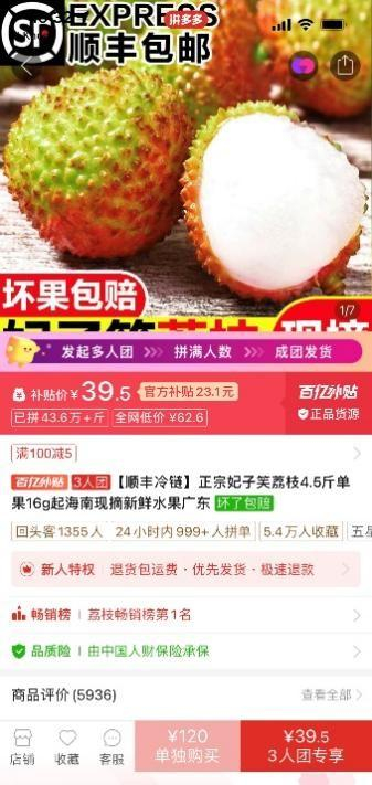 “目前,妃子笑的源头收购价已经涨到了6块5左右,比去年上涨了8成以上。”一位荔枝商家表示,在平台补贴下,百亿补贴三人团的活动价格是4.5斤仅需39元,比市场行情便宜了一半,也只比收购价贵了两块钱,且全程冷链包邮到家,日均销量已经超过16000单,日销接近10万斤。
