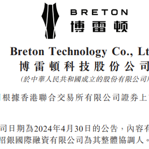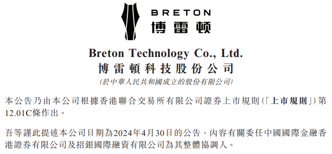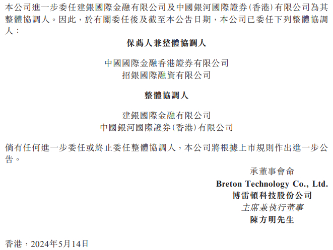 2024年5月14日,博雷顿科技股份有限公司 Breton Technology Co., Ltd (简称"博雷顿”)公告,进一步委任建银国际金融有限公司、中国银行国际证券(香港)有限公司为其整体协调人。