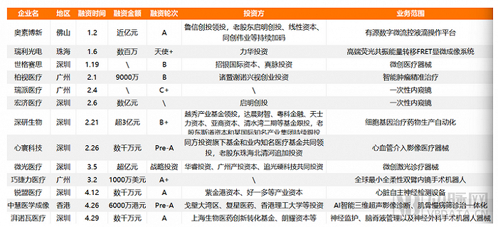 2024年,医疗投资环境稍冷,但大湾区医械企业依然融资频频。动脉网不完全统计,截至2024年4月,大湾区在医疗器械领域完成13起融资,集中在医学成像、微创手术器械等领域,与前文提到的深圳优势领域相符。