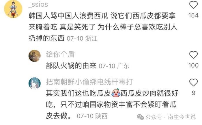之前,一位韩网友在社交平台晒出自己刚花大价钱买的一包西瓜皮,并说这是绝佳的腌制材料,甚至嘲笑中国人不知道皮也可以吃。对此,中国网友回应了一则视频——“猪啃过的西瓜皮被丢进了垃圾桶”,该韩国人看过后又破防了——“这一定是在摆拍!”