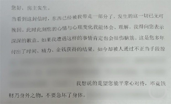 “您好,房主先生。当看到这封信时,东西已经被我带走一部分了,发生的这一切已无可挽回。”在写给失主的信中,嫌疑人“安慰”道,“望您能平常心对待,毕竟钱财乃身外之物,不要急坏了身体。”