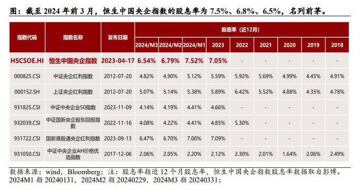 恒生中国央企指数高股息策略表现优秀,相较于红利指数,自发布以来股息率水平在A、H股市场的央企、国企主题指数中名列前茅,截至24年前3月的股息率(近12个月)为7.5%、6.8%、6.5%,均显著高于标的为A央企的中证央企红利(约5%)、中证国新央企股东回报(约4.2%)等同样侧重红利策略的主流指数。
