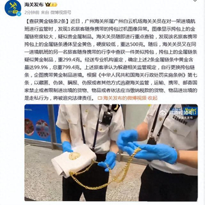 中新网5月20日电 据“海关发布”微博消息,近日,广州海关所属广州白云机场海关关员在对一架进境航班进行监管时,发现1名旅客随身携带的挎包过机图像异常。图像显示挎包上的金属链密度较大,疑似贵金属制品。海关关员随即进行重点查验,发现该名旅客携带挎包上的金属链条通体呈金黄色,硬度较低,重达500克。随后,海关关员又在同一进境航班的另一名旅客随身携带的行李中查获一件类似挎包,挎包上的金属链条疑似黄金制品,重299.4克。经送专业机构鉴定,确定上述2条金属链条中黄金含量达99.9%,总重799.4克。