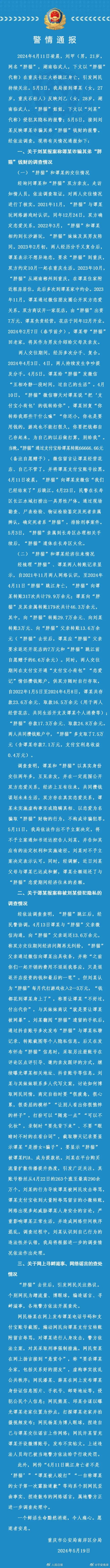 重庆市公安局南岸区分局官方微博@平安南岸通报了“胖猫”事件详情。通报称,“胖猫”和谭某双方存在真实恋爱关系,经济上互有往来,谭某未实施虚构事实或隐瞒真相、以恋爱为名骗取“胖猫”购物的行为,不构成诈骗犯罪,近日谭某已全额退还与“胖猫”恋爱期间经济往来的差额。