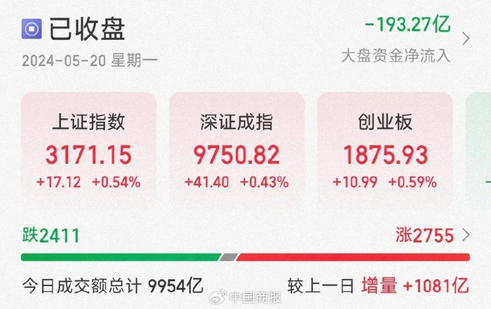 中国商报(记者 马文博)5月20日,A股三大指数集体上涨,贵金属板块大涨7.61%。截至收盘,沪指涨0.54%,深成指涨0.43%,创业板指涨0.59%。沪深两市成交额为9954亿元,较上一交易日放量1081亿元,两市超2700只个股股价上涨。