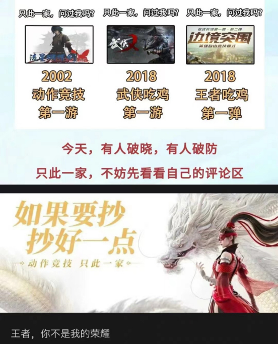 网易希望坐稳动作吃鸡“正宫”地位,腾讯方面亦有所准备。仅两小时不到,《星之破晓》公众号发布长文《王者,你是我的荣耀》,以“蹭热度”的“指控”以及早准备好的武侠吃鸡两位前辈《流星蝴蝶剑.net》与《武侠乂》反呛回去,称“有人破晓,有人破防”。