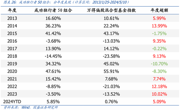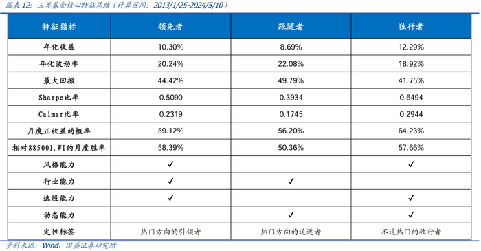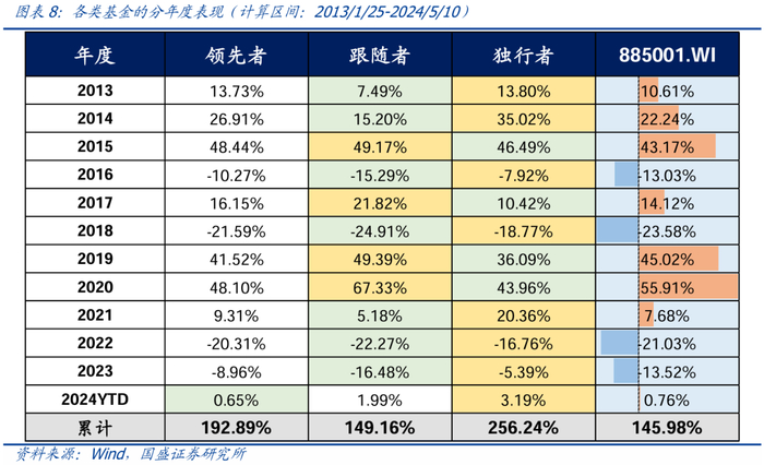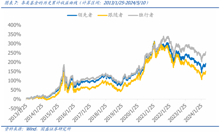 从历史长期业绩来看,独行者>领先者>跟随者。我们在每期基金季报公布后立刻更新各类型基金池,并从构建策略角度测算各类型基金接下来的平均收益。自2013年1月25日至2024年5月10日,三类基金的平均年化收益率分别为:独行者(12.29%)>领先者(10.30%)>跟随者(8.69%)。