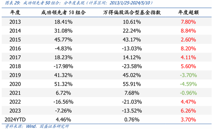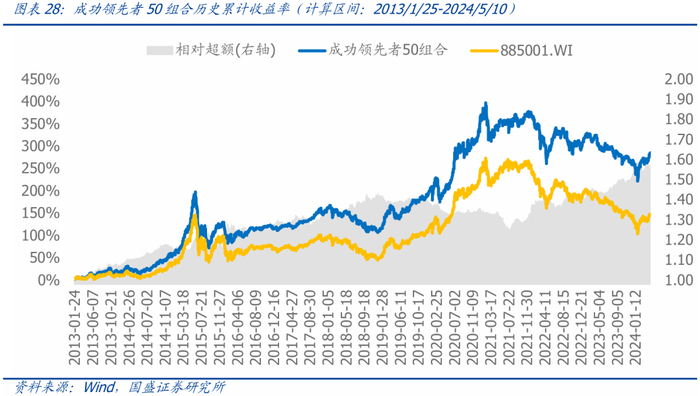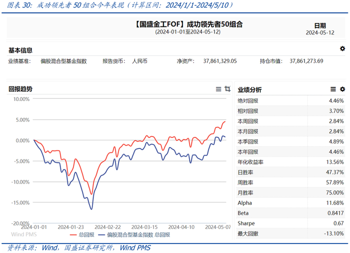 成功领先者50组合今年表现:截至2024年5月10日,今年该策略的绝对收益率为4.46%,超额收益率为3.70%,周度胜率57.89%。