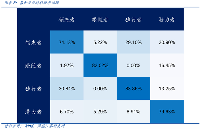 根据基金分类,计算基金从一种类型转移到其他类型的概率。从下面的基金类型的转移概率矩阵来看,对角线元素较大,前文定义的基金类型稳定性较强。具体从类型转移概率对比来看,稳定性排序为:独行者>跟随者>潜力者>领先者。其中,最稳定的是独行者和跟随者,这两类基金的跨期模仿行为特征稳定;其次是潜力者和领先者,整体而言稳定性也较强,只是相比另外两类基金而言稍弱,由此可见领先者要想做到每期持续领先并非易事。