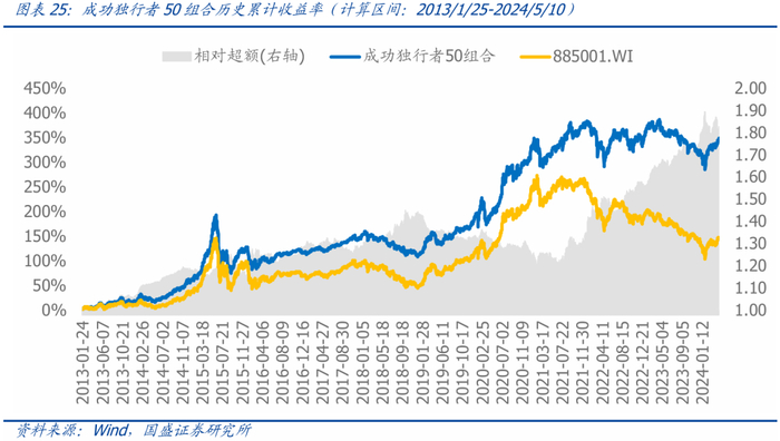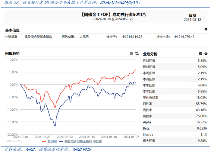成功独行者50组合今年表现:截至2024年5月10日,今年该策略的绝对收益率为5.85%,超额收益率为5.09%,周度胜率63.16%。