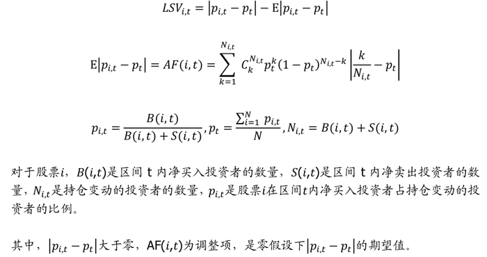 Lakonishok(1992)提出的LSV方法通过衡量股票市场中买卖双方的交易量来衡量从众效应,该方法的核心思路是检验股票市场中的股票i是否存在大量的投资者同时买入或卖出同种股票的行为,如果存在该种行为,则股票i的投资者存在从众效应。