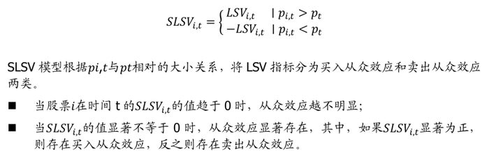 在上述LSV模型中,LSV_(i,t)的值越大,则说明投资者的从众效应越严重,但LSV模型的缺陷是无法区分投资者是买入还是卖出股票的从众效应。于是Wermers(1999)将LSV模型进一步改进为SLSV模型,划分出了两个指标: