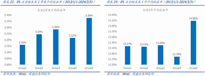 类似地,长期来看,跨期领先效应因子IFL最大分组的基金通常未来业绩较好。每季度按照基金样本的IFF因子值升序排序将基金分成5组,测算各分组基金未来区间的平均收益率。短期季度预测和长期年度预测都不是严格单调的关系,IFL因子季度预测的历史IC均值为0.03,预测效果相比IFF而言比较弱一些。但第5分组(领先效应最大组)的未来收益率显著较高,因此领先效应最大分组的基金更值得关注。