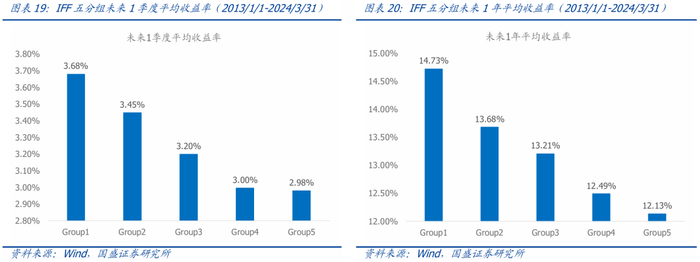 长期来看,基金的跟随效应因子IFF越大,未来业绩越差。每季度按照基金样本的IFF因子值升序排序将基金分成5组,测算各分组基金未来区间的平均收益率。不论是短期季度预测还是长期年度预测,都呈现严格单调递减的效应,即IFF因子越大的分组,未来收益率往往越小。第1分组(跟随效应最小组)的未来收益率显著较高,第5分组(跟随效应最大组)的未来收益率显著较低。
