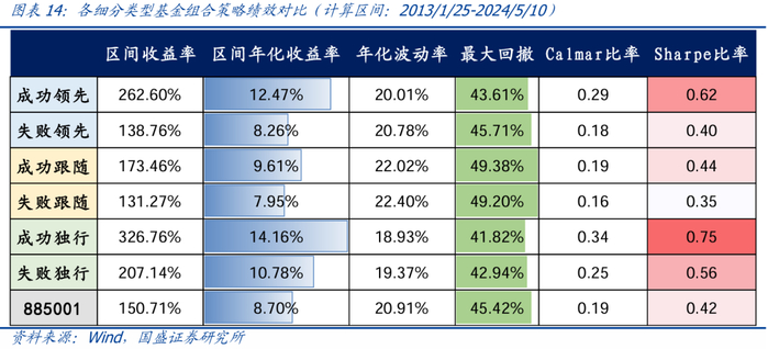 按业绩二分:叠加Sharpe因子进行二分,各细分类型基金组合的年化收益区分度更加显著。成功领先者平均年化收益率为12.47%,成功独行者平均年化收益率为14.16%,而失败跟随者平均年化收益率仅为7.95%。