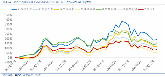 从分类定义来看,领先者、跟随者、独行者最本质的区别是对热门股的态度不同,业绩因子Sharpe则进一步将基金分类二分为历史上做得成功或失败,前文提到这几类基金在选股能力上存在较大的差异。基金季报公布仅滞后15个工作日,这里我们想探讨一个有意思的问题:是否可以通过“模仿”的方式,模仿成功领先者或者成功独行者做投资,抑或反向避免失败跟随者做投资。接下来我们分别从个股模仿与行业模仿2个角度都做了尝试,发现成功领先者、独行者的重仓股、重仓行业都具备一定的借鉴意义。
