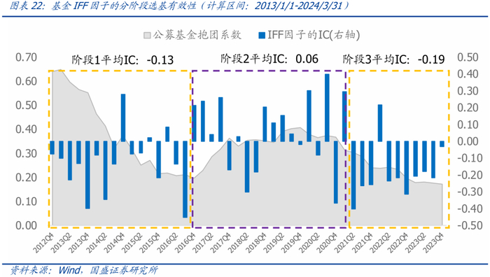 2、基金IFF因子通常为反向选基因子,但在公募抱团系数上行时会阶段性失效。根据公募基金抱团系数大致将历史区间划分成3个阶段,在公募抱团系数下行区间,IC均值为负,在公募抱团系数上行区间,IC均值为正。因此,通常情况下基金IFF是一个优秀的反向选基因子,但如果市场抱团效应大幅上行会干扰IFF因子的有效性,此时抱团追热点反而是“正确”的事情,真正具备自主选股能力的基金经理难以被识别。
