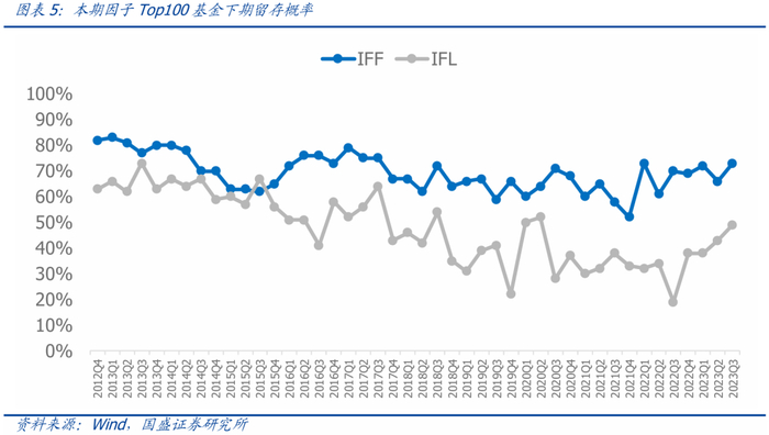 根据基金因子的大小,每期选择因子值Top100的基金,计算下期仍处于Top100的留存概率。留存概率越大则稳定性越好,也就是说每次选出因子最大的100只基金,下期更新因子之后相应的Top100基金名单不会剧烈变化。从因子Top基金留存概率来看,根据IFF与IFL得到的Top100基金留存概率较大,稳定性较好。