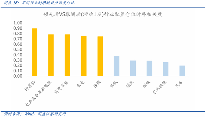 领先者型基金往往在寻找热门度提升较大的方向进行投资,而跟随者型基金倾向于投资已确认是热门的方向。领先者偏向左侧布局,而跟随者更多是偏向右侧抓趋势追进。那么具体哪些行业更容易发生这种现象,遍历每个行业,从时序角度来看领先者的行业配置与滞后1期的跟随者行业配置相关度较高,尤其是计算机、电力设备及新能源、商贸零售、家电、传媒等行业这种跟随效应更加显著。