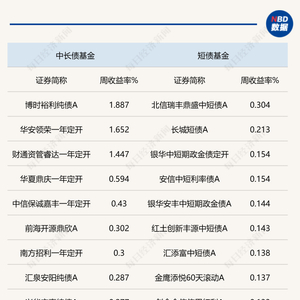 这样的局面其实并不难理解,本质上是因为长期债券的供应增加,有的资金退旧换新;而从基金的表现来看,对应长期债券的收益率的提升,短端收益率水平的下降,中长期纯债基金的周收益率中位数在0.0982%,而短债基金的周收益率中位数在0.0667%。