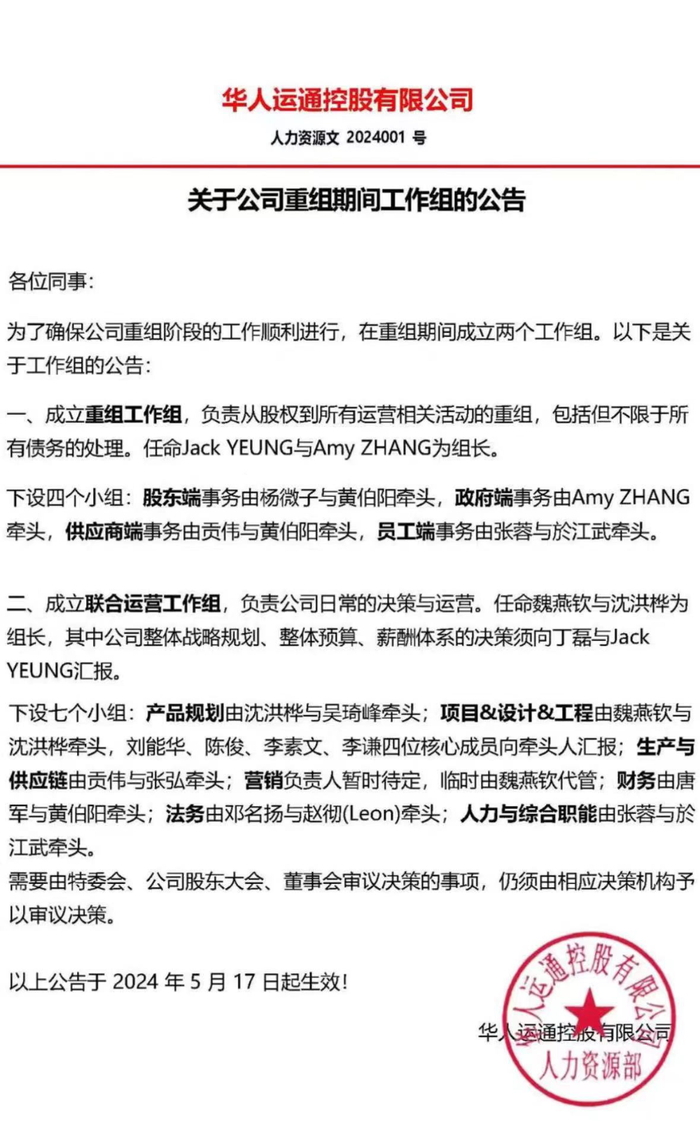 随后,“高合汽车于重组期间筹备工作组”的公告流出,编号001意味着这是今年高合内部首份公告。另外,该公告中明确重组工作将会由两个工作组共同推进——重组工作组和联合运营工作组。