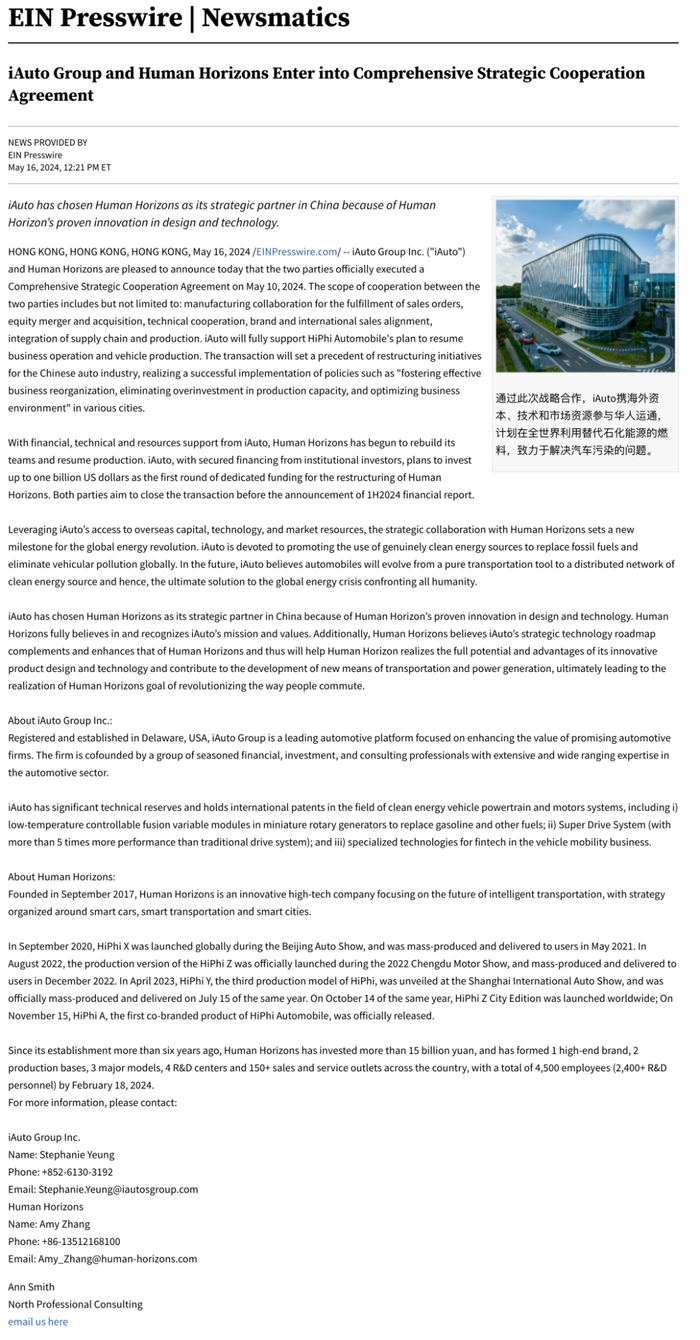 5月17日,有海外消息指出,高合汽车母公司华人运通与汽车投资咨询平台iAuto,于5月10日在香港签署了全面战略合作协议,双方合作范围包括但不限于完成销售订单的生产协同、股权并购、技术合作、品牌和国际销售对接,以及供应链与生产制造的相关整合。