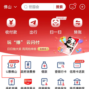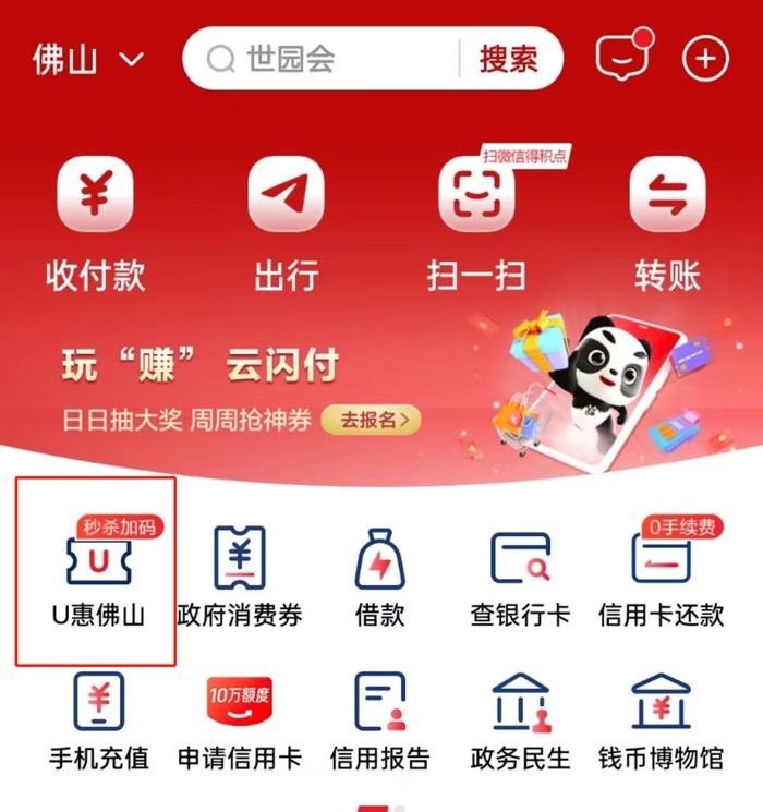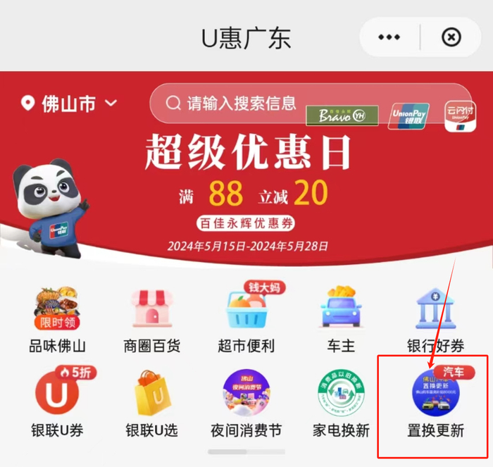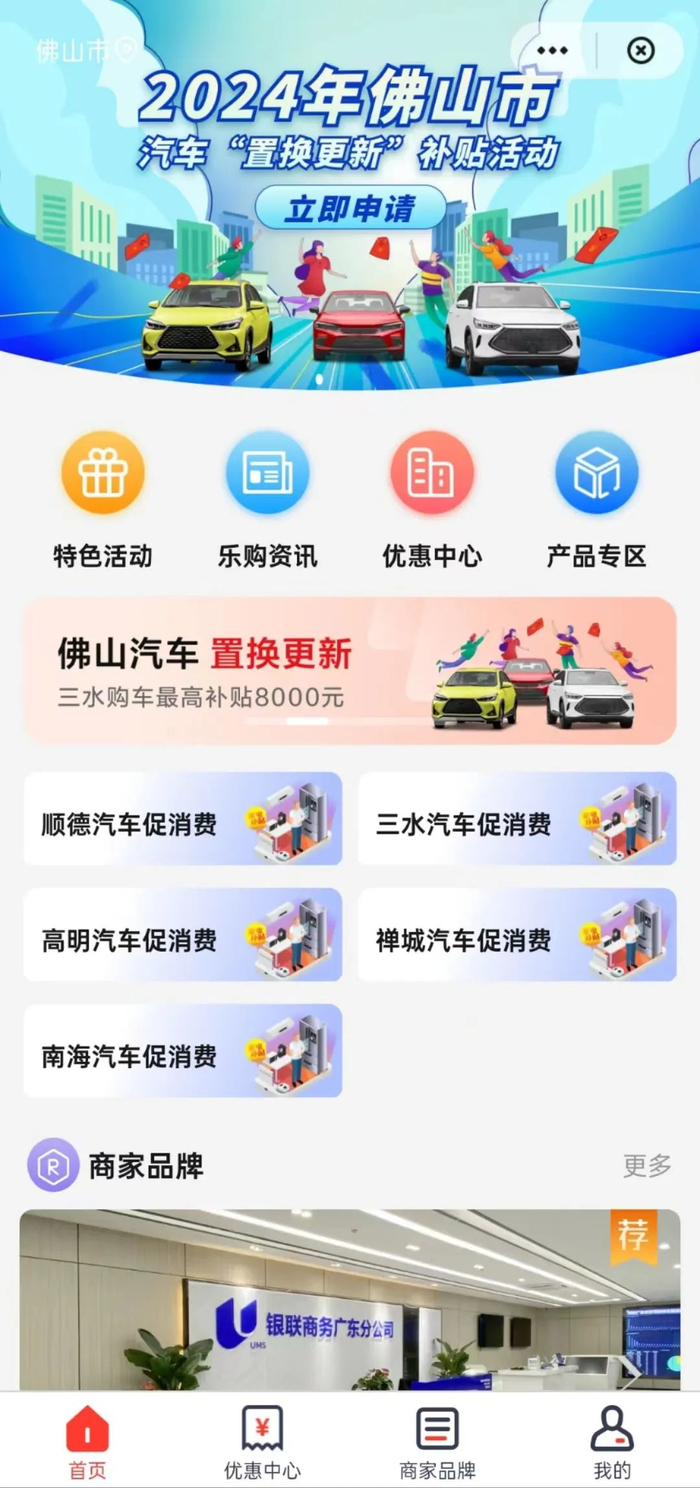 第一步:登录云闪付App,打开手机定位至佛山市,点击 “U惠佛山”-“置换更新”专区,进入“银商乐购”页面。
