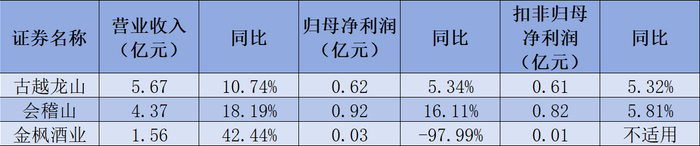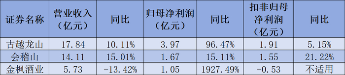 2024年一季度,古越龙山实现营业收入约5.67亿元,同比增长10.74%;归母净利润约0.62亿元,同比增长5.34%;扣非归母净利润约为0.61亿元,同比增长5.32%。会稽山实现营业收入约4.37亿元,同比增长18.19%;归母净利润约0.92亿元,同比增长16.11%;扣非归母净利润约0.82亿元,同比增长5.81%。金枫酒业实现营业收入约1.56亿元,同比增长42.44%;归母净利润约为267.29万元,同比下降97.99%;扣非归母净利润约为127.36万元,同比不适用。