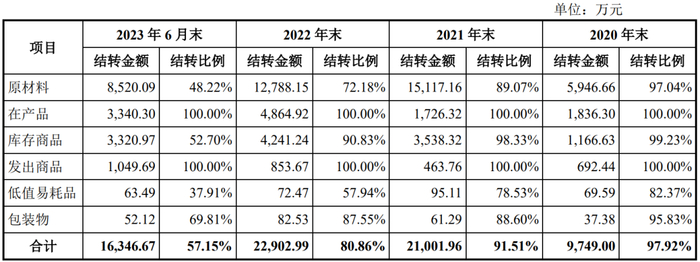 报告期各期末公司各项存货的期后结转金额及占期末存货账面余额的比例情况如下: