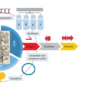 科学家会先使用计算机软件辅助设计要合成的 DNA 构建。设计的 DNA 将被分为 1–1.5kb 的可合成片段(synthons)。合成片段可以通过单链寡核苷酸进行组装拼接合成,组装成更大的 DNA 元件。组装好的 DNA 需要进行两步验证:序列验证和将其转化到细胞后的功能验证。根据验证结果,进行修改,重复测试循环,直到获得所需要功能的 DNA 构建体。