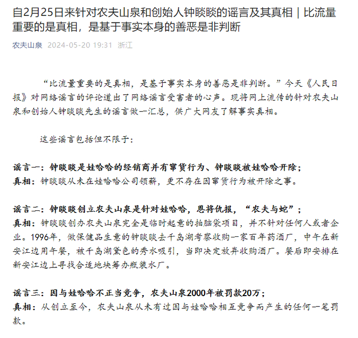 虽然钟睒睒一度发文回应公众的质疑,但舆论并未就此平息。5月20日,农夫山泉在公众号发表一篇名为《重要的是真相,是基于事实本身的善恶是非判断》的文章,针对网上流传的农夫山泉和创始人钟睒睒先生的谣言进行了汇总,并称将追究法律责任。