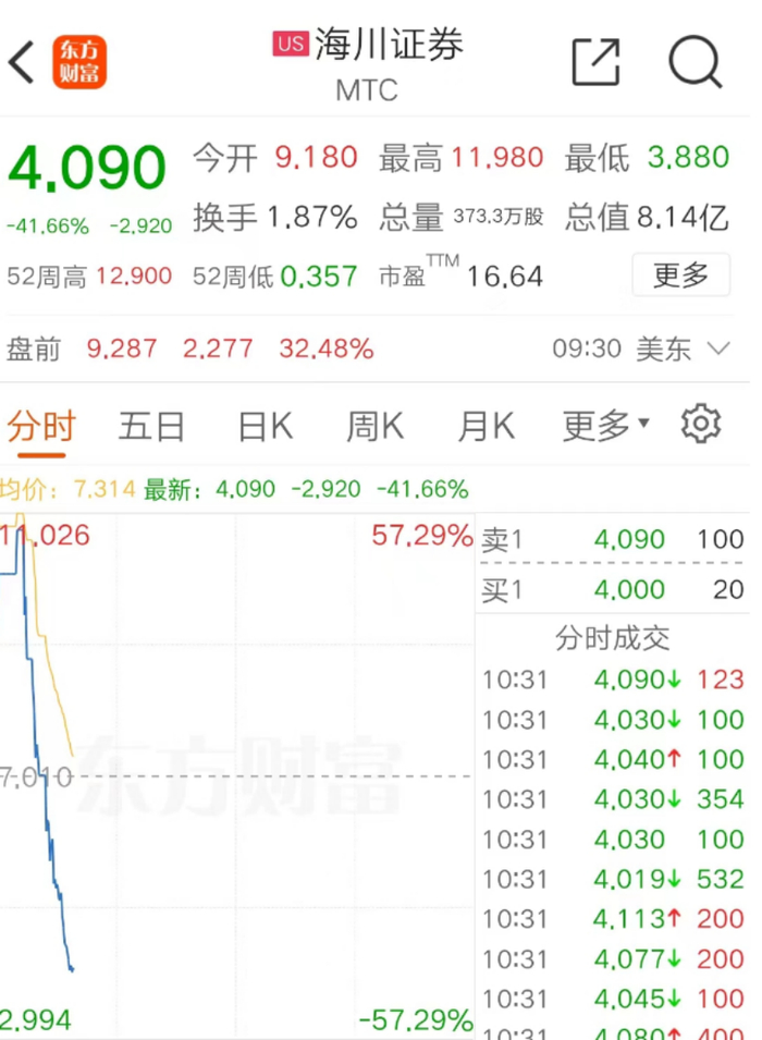 中资券商股玩起了深夜“蹦迪”,海川证券(MTC.US)盘前一度飙升逾110%至15美元。不过,美股开盘后,海川证券出现高位跳水,截至北京时间22:30,海川证券暴跌超40%。
