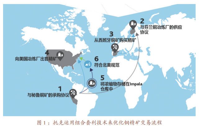 在对大宗商品进行时间、空间与形式上转换的过程中,交易商获取利润。根据托克提供的例子,假设芬兰铜冶炼厂本欲从秘鲁买铜矿,通过交易商的撮合,芬兰冶炼厂转买西班牙铜矿,而交易商将秘鲁的铜矿卖给美国冶炼厂。相比初始从秘鲁到芬兰的路线,这两笔交易使得交货航程缩短,并且总体航运费有可观的缩减。交易过程的具体步骤如下(图1):