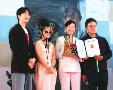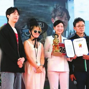 5月12日,韩国“汉江发呆大赛”冠军手捧小金人在赛后留影。