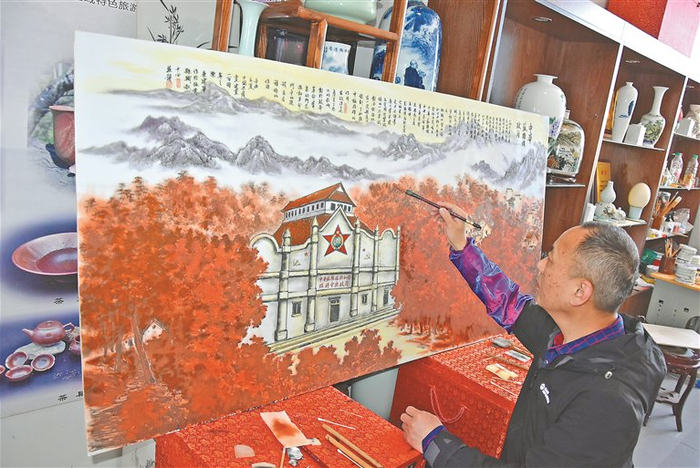 陶瓷青花汾水画技艺代表性传承人康建华在作画。