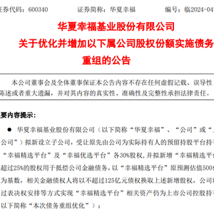 5月20日晚间,华夏幸福(600340)宣布了一项债务重组计划,计划新设立子公司,受让“幸福精选平台”及“幸福优选平台”各30%的股权,并新增“幸福精选平台”不超过25%的股权用于抵偿公司金融债务。相关金融债权人将以不超过125亿元债权换取上述新增股权。