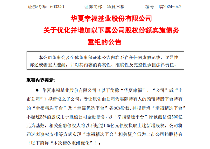 此前为推动债务重组工作,华夏幸福以下属公司股权搭建“幸福精选平台”及“幸福优选平台”用于抵偿金融债务及经营债务,以“幸福精选平台”预测估值500亿元、“幸福优选平台”预测估值521.40亿元为基数向债权人实施债务重组,即债权人以不超过400.39亿元债权换取“幸福精选平台”及“幸福优选平台”分别不超过49%股权。
