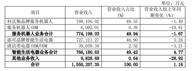 分业务来看,科沃斯品牌服务机器人销售收入76.81亿元,添可品牌高端智能生活电器销售收入72.71亿元。科沃斯及添可两大自有品牌业务收入合计达149.52亿元人民币,较上年增长1.67%,占公司报告期总收入的96.45%。