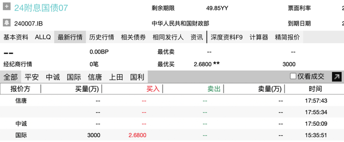 查了一下今年 3 月发行的 24 附息国债 07 的价格,这个剩余期限 49.86 年的长超期国债,对应的利率也不过是 2.68%左右。