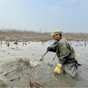 邱珍兵跟在师傅后面。只见老师傅先将淤泥挖出来一个半米的深坑站在里面,凭着经验找准莲藕卧在淤泥的哪个位置。一年后,邱珍兵才掌握了怎么找莲藕:那些又细又韧的荷梗下方就是莲藕的头,尾部通常有两根相邻的荷梗。