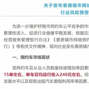 5月20日,景德镇发布网约车行业风险预警通告。